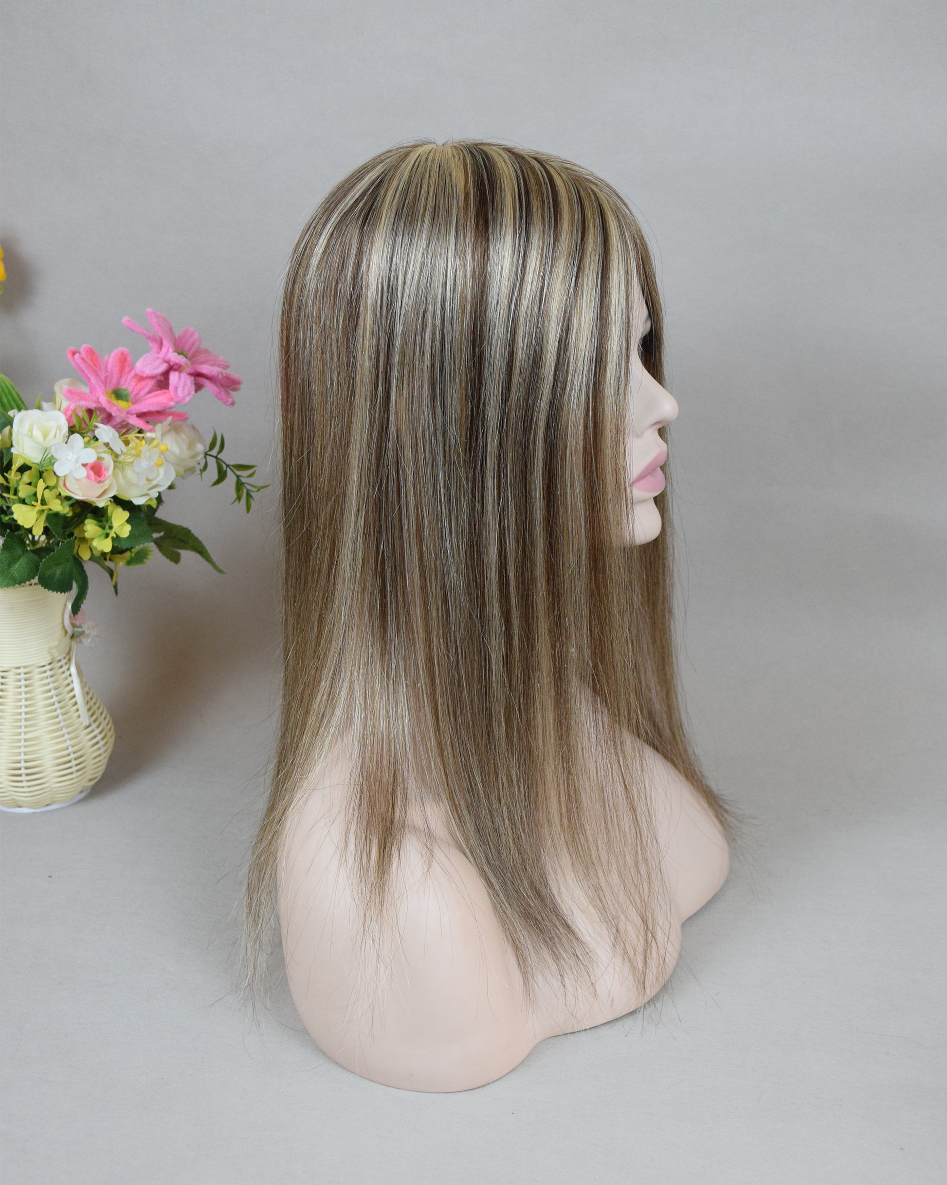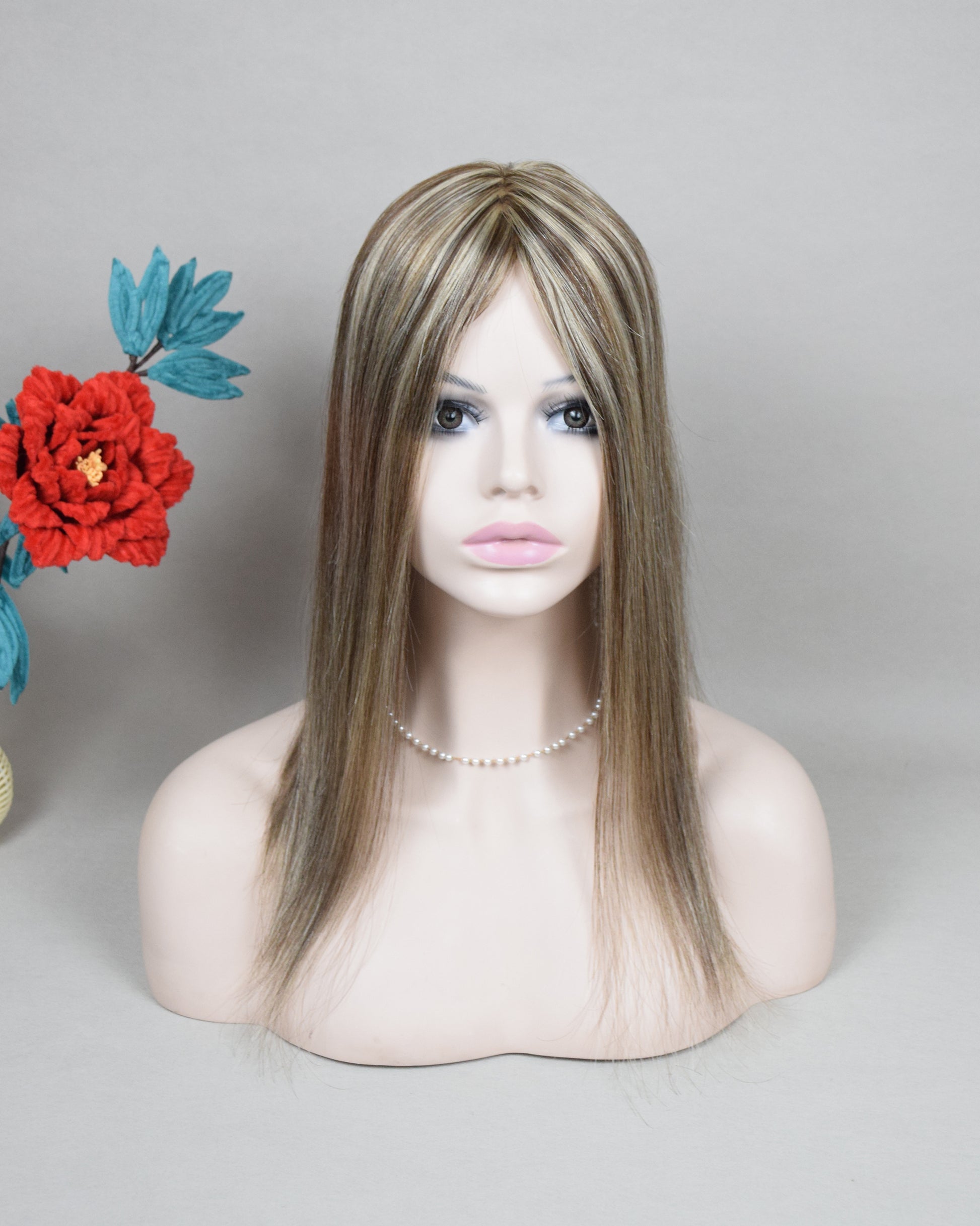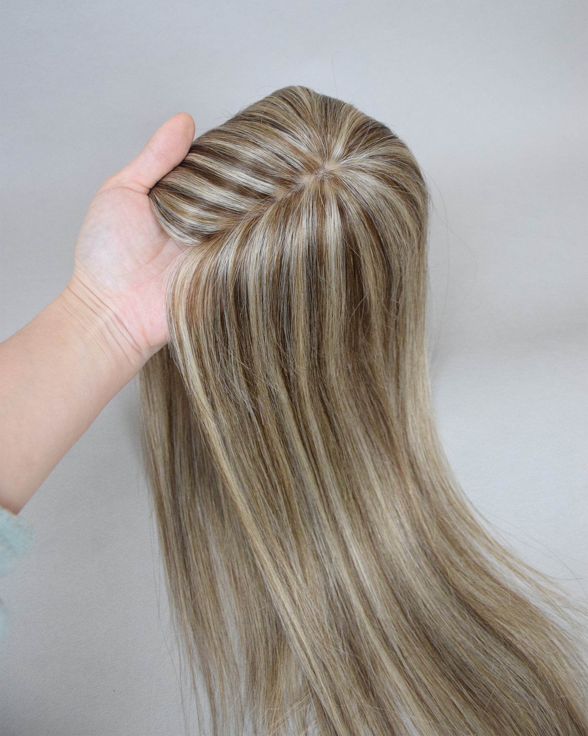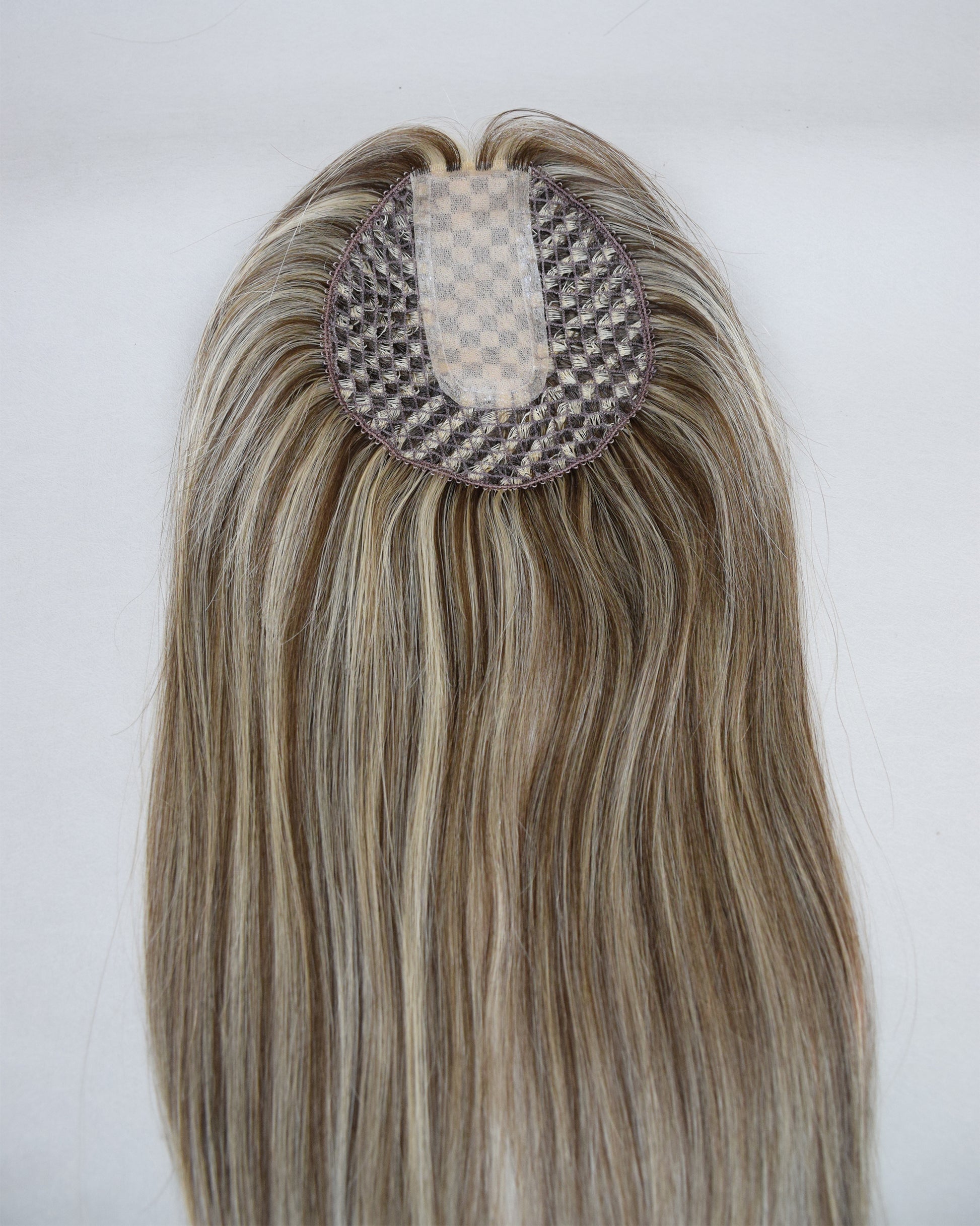 16'' Brown Highlights Fishnet Integrated Topper With Silk Top Breathable Integration Hair System For Thinning Hair European Human Virgin Hair Topper for Women.