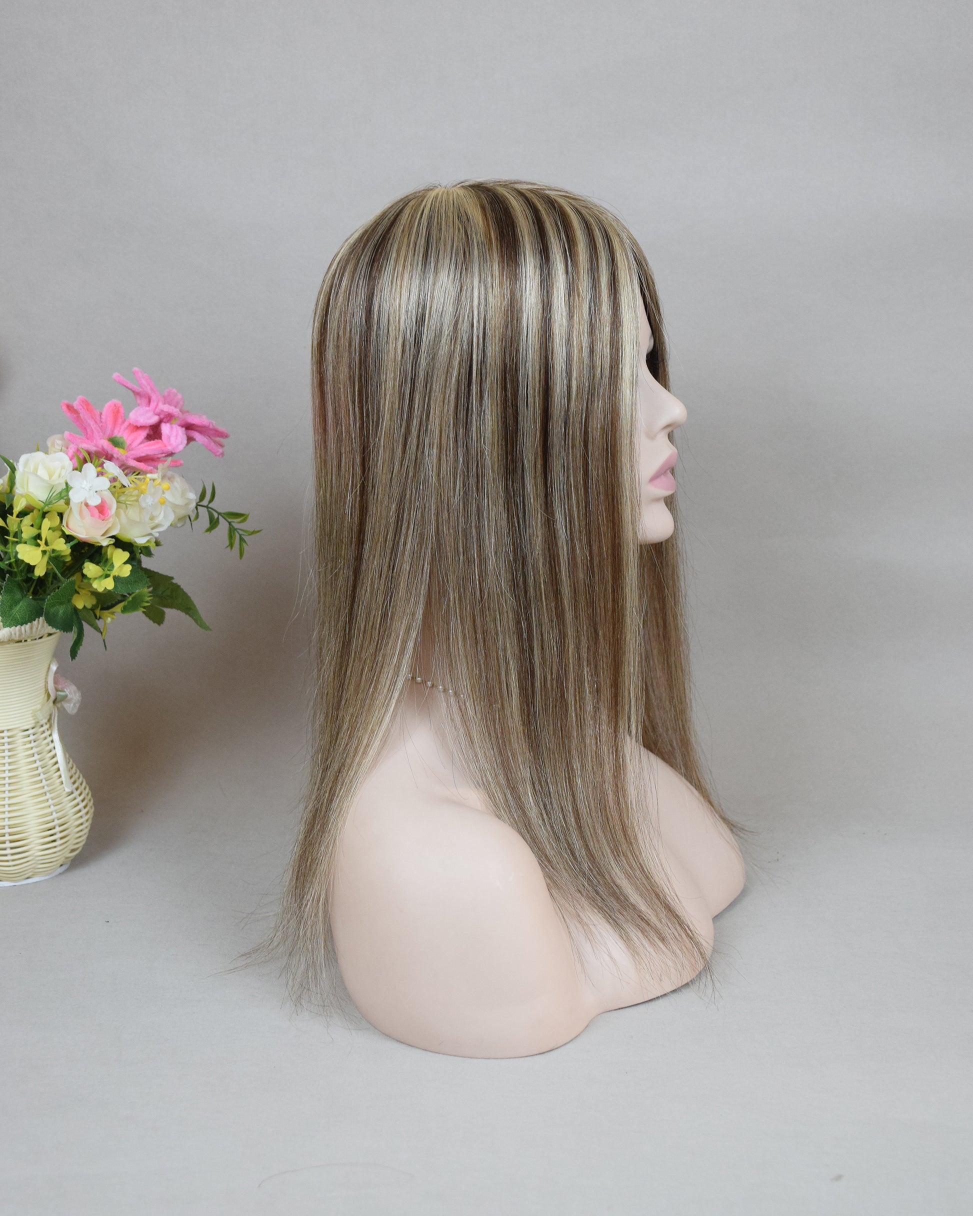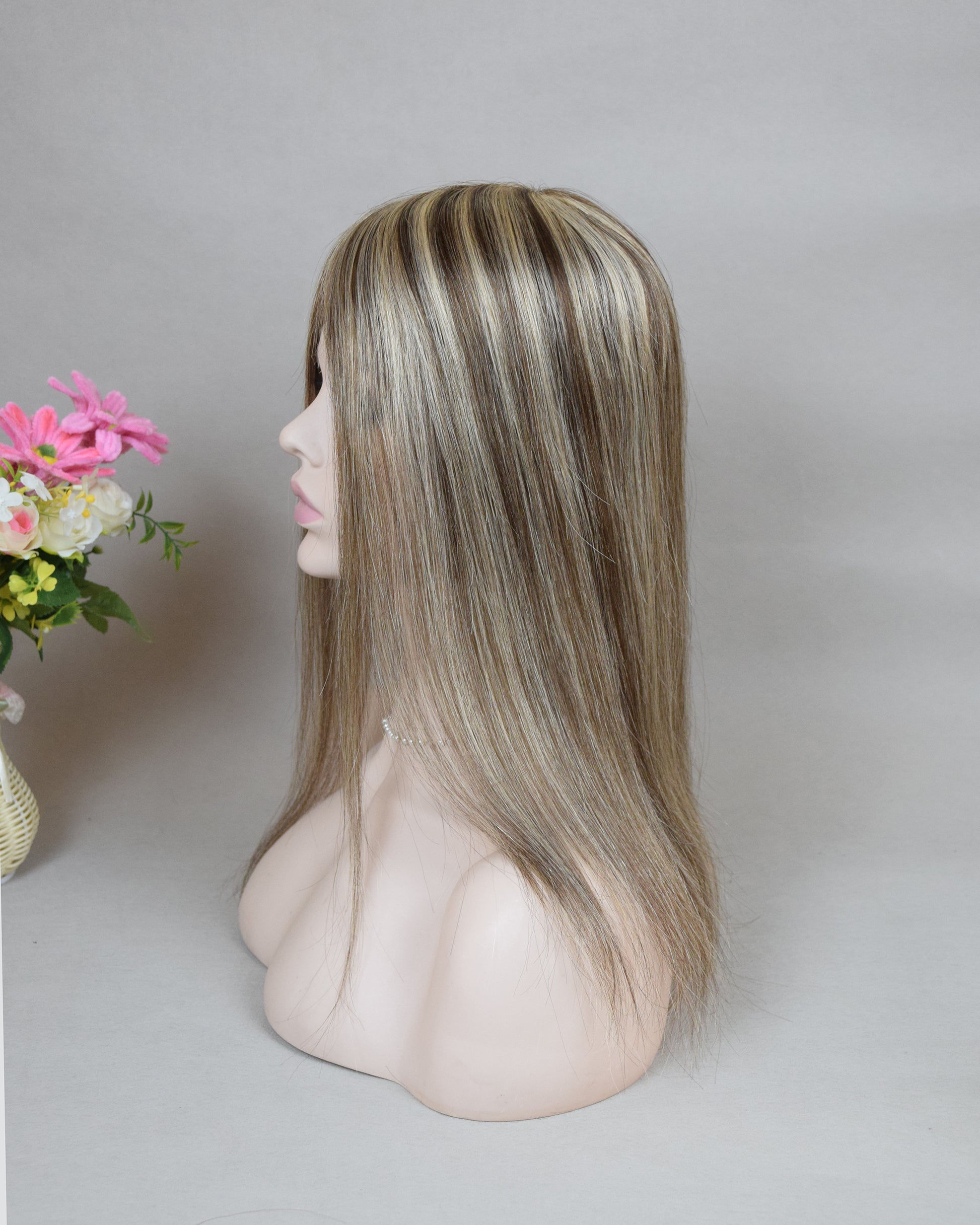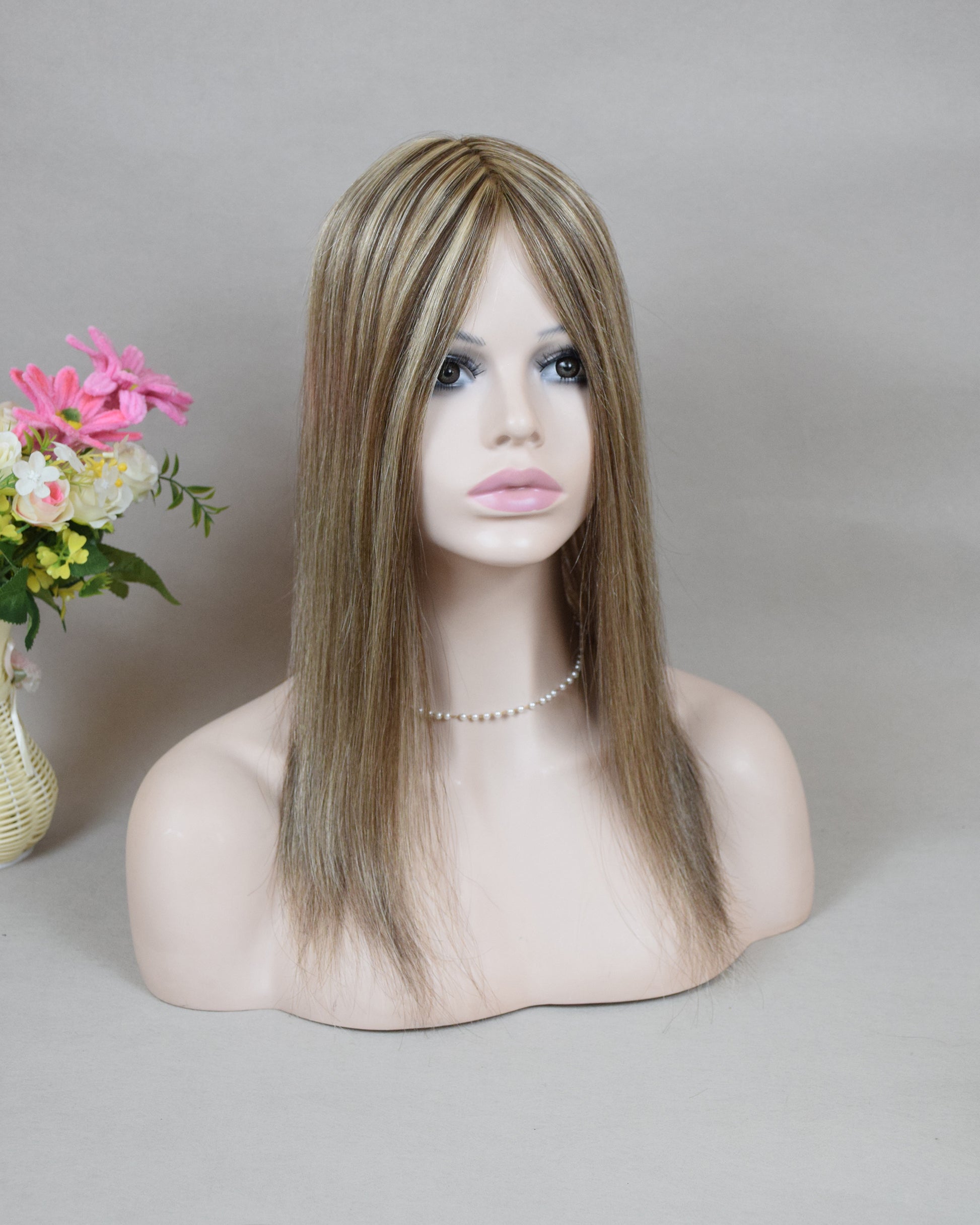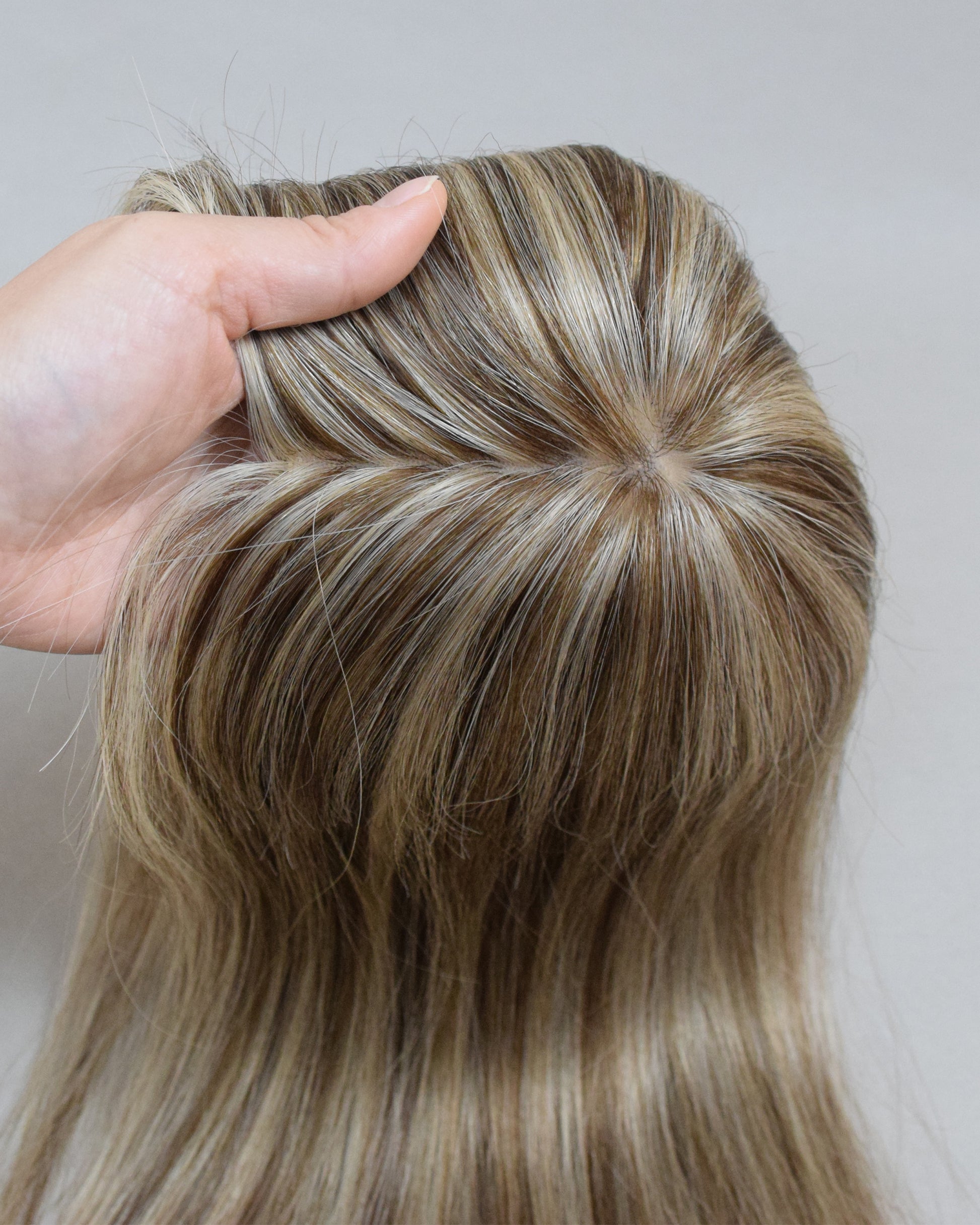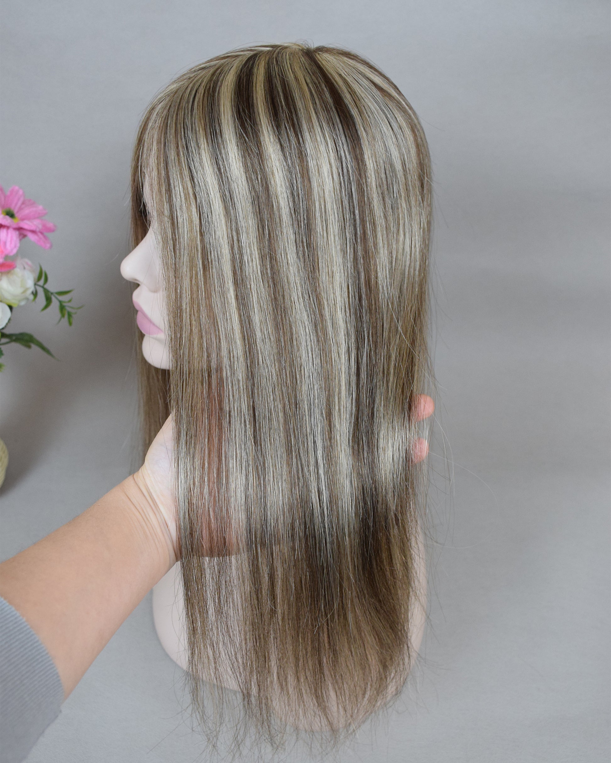 16'' Brown Highlights Fishnet Integrated Topper With Silk Top Breathable Integration Hair System For Thinning Hair European Human Virgin Hair Topper for Women.